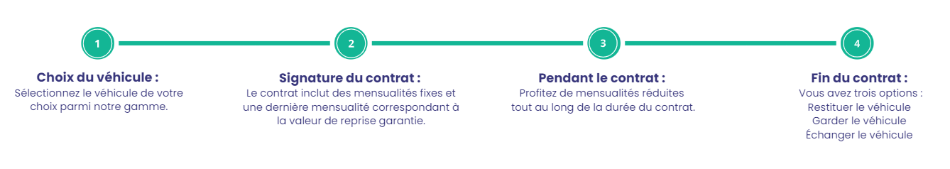 Dès le début du contrat, vous êtes propriétaire du véhicule. La valeur résiduelle du véhicule est fixée à la signature du contrat vous permettant de connaître à l'avance le montant de la dernière mensualité majorée. Cette transparence vous aide à planifier sereinement la fin de votre contrat.